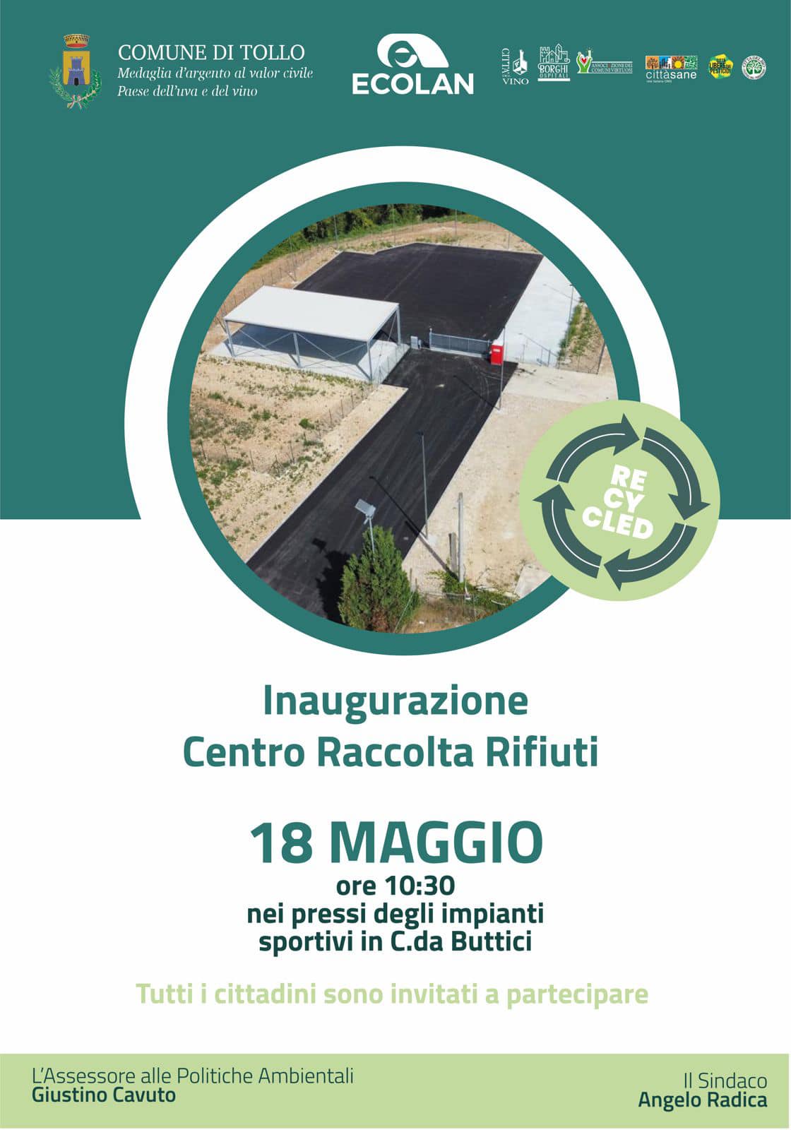 Alla presenza di autorità politiche e religiose alle 10.30 verrà inaugurato il Centro Raccolta Rifiuti sito in Contrafa Buttici nei pressi degli impianti sportivi.